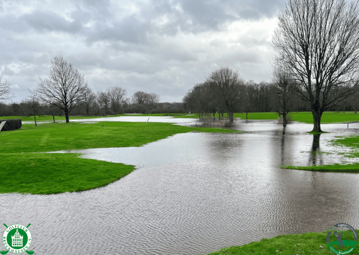 Ein kurzer Rundgang heute über den Platz durch Matsch und viel Wasser zeigt- schnell wird sich nix an der notwendigen Platzsperre ändern. Die Kleine Angel läuft über, Loch 15 ist zum Inselgrün geworden. Selbst auf Hügeln sinkt man tief in den Matsch ein. Und auf dem Weg zurück vom Platz dann im Lokalradio die Unwetterwarnung…