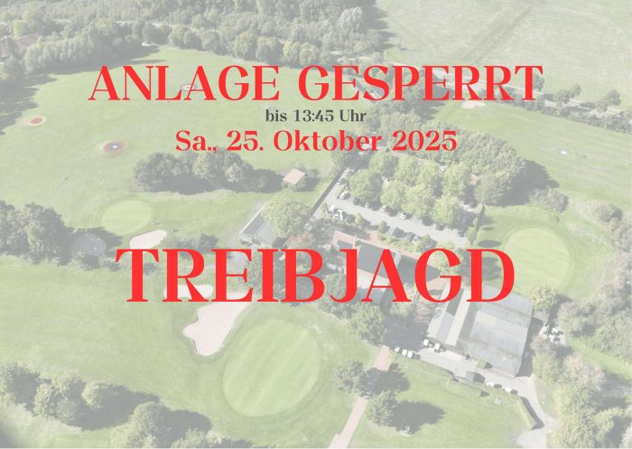 Liebe Mitglieder, liebe Gäste, am Samstag, 25.10.2025 findet auf der gesamten Anlage (Übungsanlage, Platz und Parkplatz) des GC Brückhausen eine Treibjagd statt. Das Betreten der Anlage ist deshalb aus Sicherheitsgründen nicht vor 13:45 Uhr gestattet! Auch wenn die erste Startzeit bereits um 14:00 Uhr wieder freigegeben ist. Unsere Trainer dürfen leider ebenfalls keinen Unterricht bis…