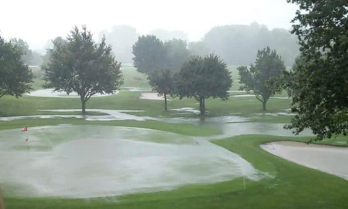 Das Unwetter am 14. Juli 2021 hat weite Teile von Nordrhein-Westfalen stark betroffen. Unser Golfplatz kam noch recht glimpflich davon, bekam „nur“ rund 90 Liter Regen pro Quadratmeter im Starkregen während des laufenden Herrennachmittages ab. Überschwemmte Grüns, vollgelaufene Bunker, riesige Pfützen waren die Folge. 90 l/qm oder 9 cm Wassersäule verschwinden halt nicht sofort.  Sofort verschwand das…
