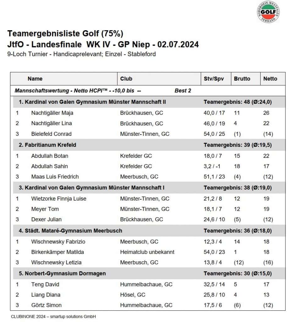 Für die Kids des Kardinal-von-Galen Gymnasiums – Maja & Lina Nachtigäller (GCB), Finnja Wietzorke (GC Tinnen), Conrad Bielefeld (GC Tinnen), Julian Dexer (GCB) und Tom Meyer (GC Tinnen) – ging es am 02. Juli 2024 in den GC Niep zum Landesfinale von „Jugend trainiert für Olympia“.