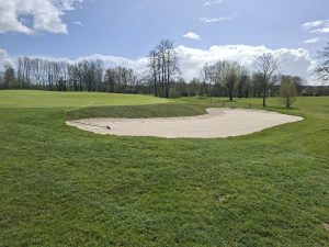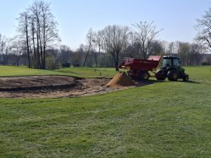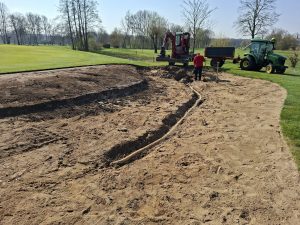 Als mit steigenden Temperaturen der Rasenwuchs einsetzte, wurden einige Bunker generalsaniert: Erneuerung der Drainagen, des Unterbaus, der Sandbefüllung und – als wohl augenfälligste Maßnahme – Herabsetzen der Bunkerkanten und Neuverlegung von Rasensoden zwischen neuen Bunkerkanten und Grüns. Diese Arbeiten sind in langen Abständen von rund 20 und mehr Jahren erforderlich, um dem allmählichen Anwachsen des Geländes zwischen Bunkern und Grüns entgegenzuwirken. Sie dienen nicht nur dem Spielfluss und der Spielfreude, sondern auch der Optik, wie die nachfolgende Bilderserie belegt.