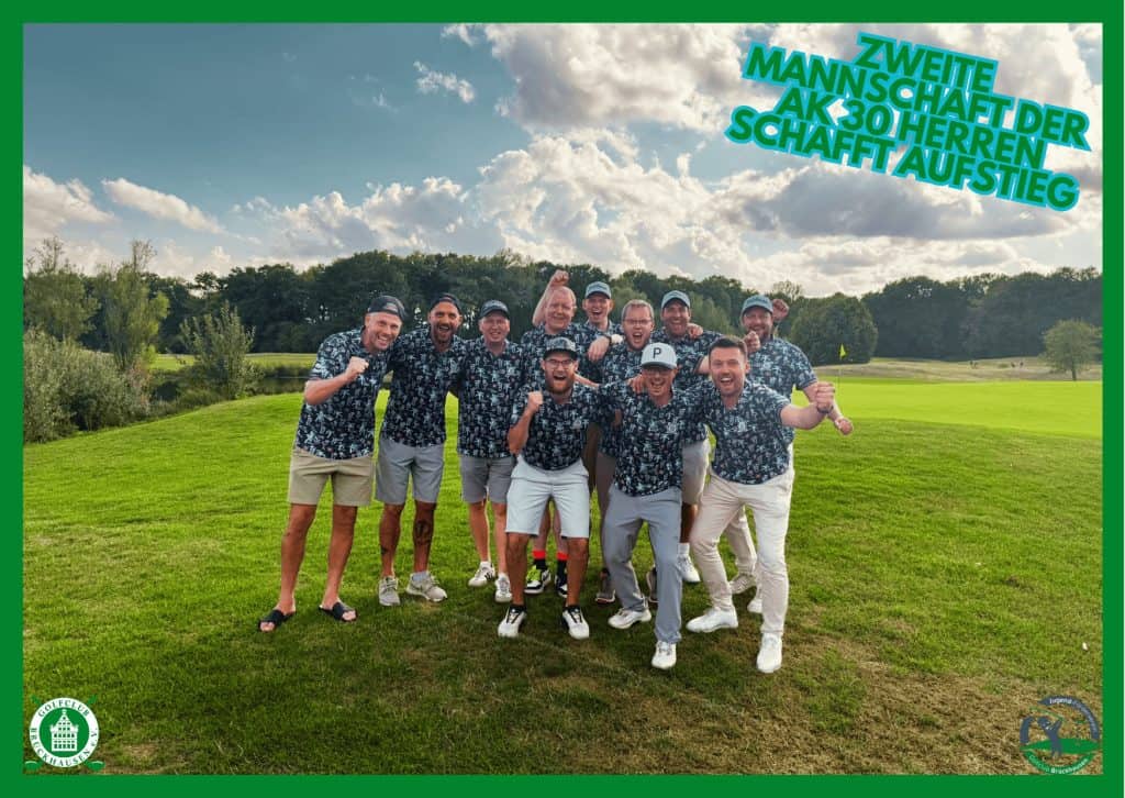 Mit einem super Auftritt am letzten Spieltag hat die zweite Mannschaft der Brückhausener AK 30 Herren den Aufstieg in die 4. Liga geschafft. Vor dem Saisonfinale im Golfclub Münster-Tinnen hatte das GCB Team zwei Punkte Rückstand auf den Golfclub Osnabrück-Dütetal an der Tabellenspitze, durch den Tagessieg des GCB und den dritten Platz der Osnabrücker wendete sich das Blatt aber noch und der Aufstieg war perfekt. Mariusz Pinior legte mit seiner sensationellen 77er Runde den Grundstein für den Erfolg. Es folgten starke und solide Scores von Frederic Simon (82), Stephan Luig (83) und Colby McGill (86). Patrick Spangenberg und Marcel Kirchhof benötigten jeweils 92 Schläge, die 92 war dementsprechend auch das Streichergebnis. Ausgezahlt haben sich am Ende der Saison damit auch die weitsichtigen Aufstellungen der Kapitäne René Bisplinghoff, Stephan Luig und Jan-Christoph Menke. Die zweite Mannschaft konnte am letzten Spieltag entscheidend gestärkt werden, weil sich mehrere Akteure noch nicht in der Ersten fest gespielt hatten. Diese spielte am letzten Spieltag ebenfalls in Tinnen, musste sich diesmal allerdings mit dem letzten Platz in der Tageswertung zufrieden geben. Folgende Spieler waren für den GCB am Start: Oliver Wallscheid (86), Philipp Haske (91), Dirk Münstermann (91), Dietmar Kurtz (94), Bernd Ruberg (94) und Streicher Daniel Schröder (95). Negative Auswirkungen hatte das zum Glück nicht mehr, denn der Klassenerhalt war schon eine Woche zuvor im Golfclub Nordkirchen klargemacht worden.